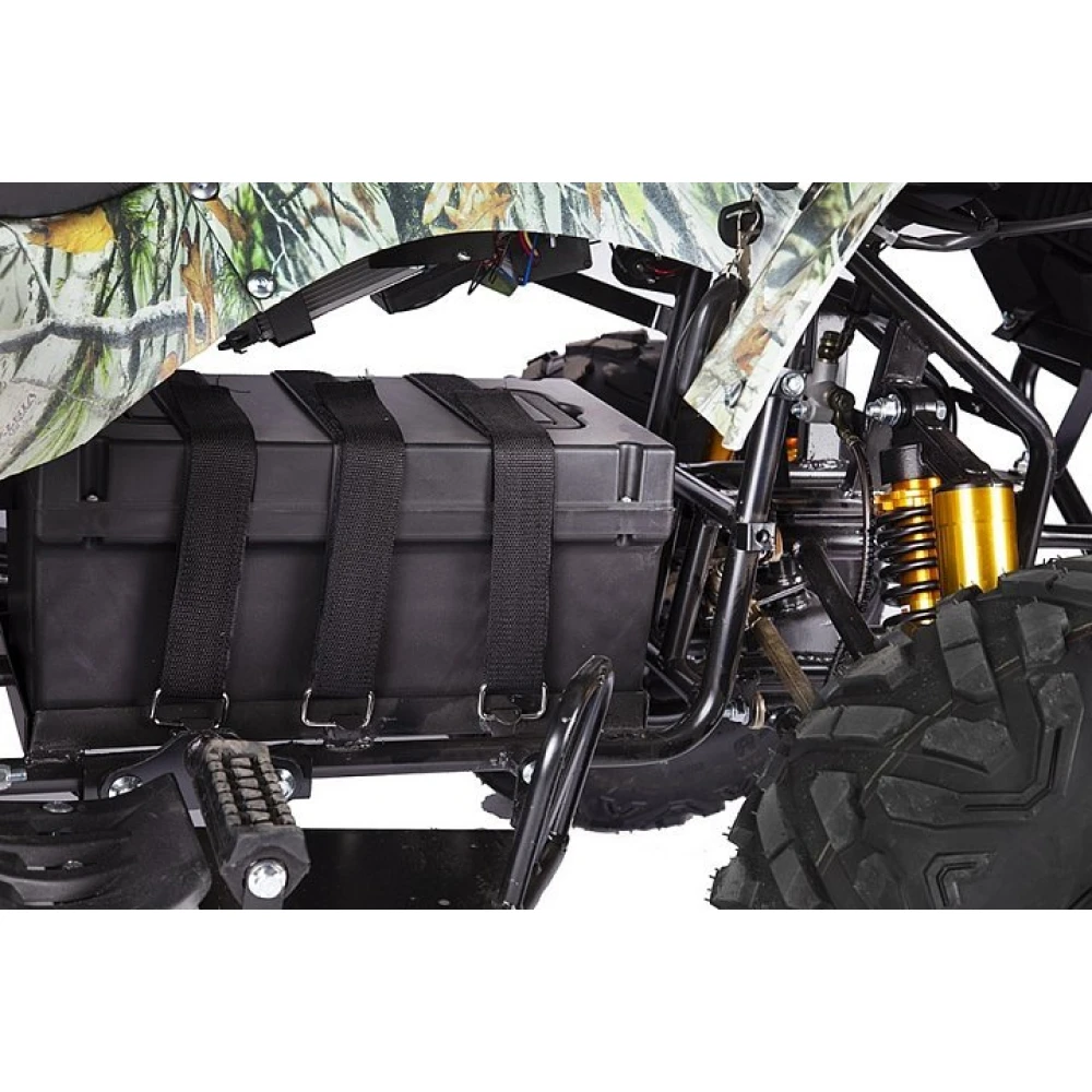 Электроквадроцикл укомплектован багажником, зеркалами заднего вида, охранной сигнализацией, безотказной тормозной системой.