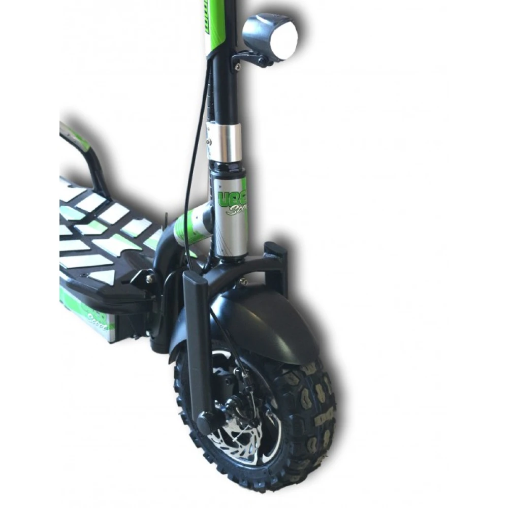 Электросамоката Uber Scoot ES07 имеет аккумулятор 12 А/ч, его емкости хватает на 27 км. Зарядка продолжается 6 часов. Отличительной особенностью этой модели являются широкие колеса 12 дюймов, благодаря этому клиренс 110 мм, и повышенная проходимость. Все это говорит о том, что на этом агрегате можно ездить и по бездорожью. Фары впереди и сзади позволяют пользоваться транспортным средством в темное время суток.