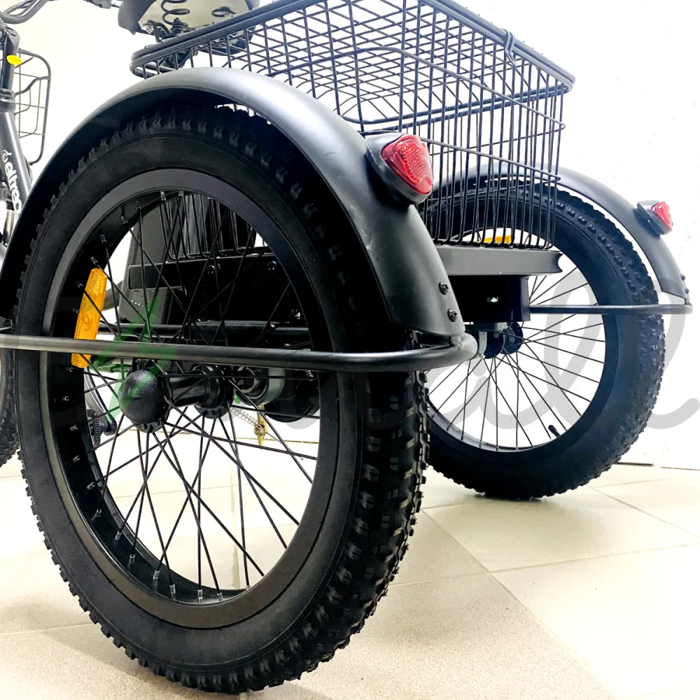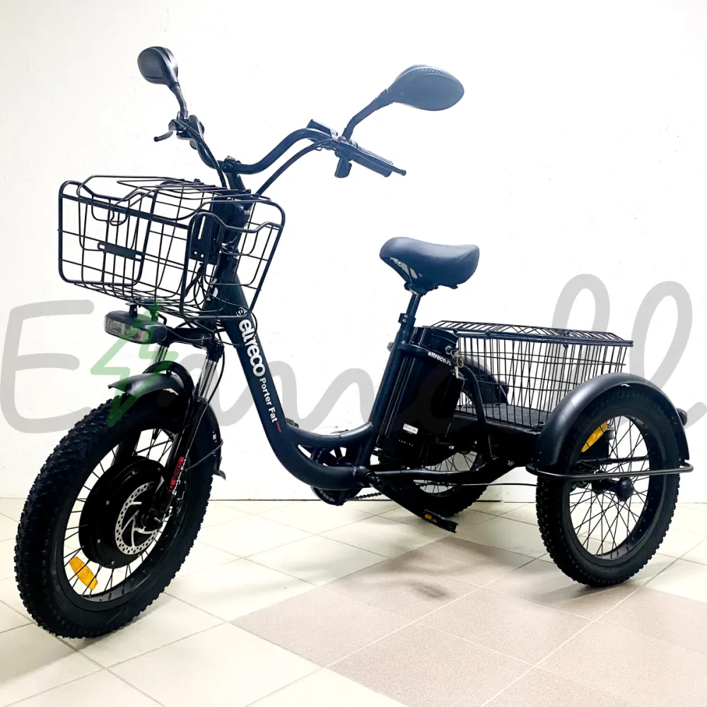 ТРИЦИКЛ ELTRECO PORTER FAT 500 UP! работает от долговечной аккумуляторной батареи. Если она разрядилась, трицикл сможет проехать еще до 40 км на резерве. Имеет стильные светодиодные фары, стальные полноразмерные крылья. Впереди на руле расположена легкая корзина, сзади – большая вместительная.